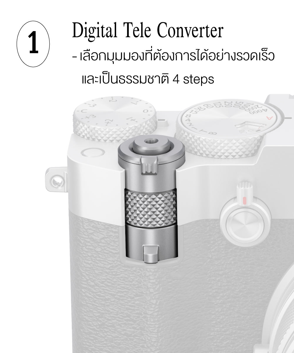 Fujifilm has designed a lever on the front of the camera to make it easier to use the Digital Teleconverter function. It offers four different angles of view: 35mm (28mm), 45mm (36mm), 63mm (50mm), and 80mm (63mm) (equivalent in a 35mm system camera), adding flexibility to your shooting.
