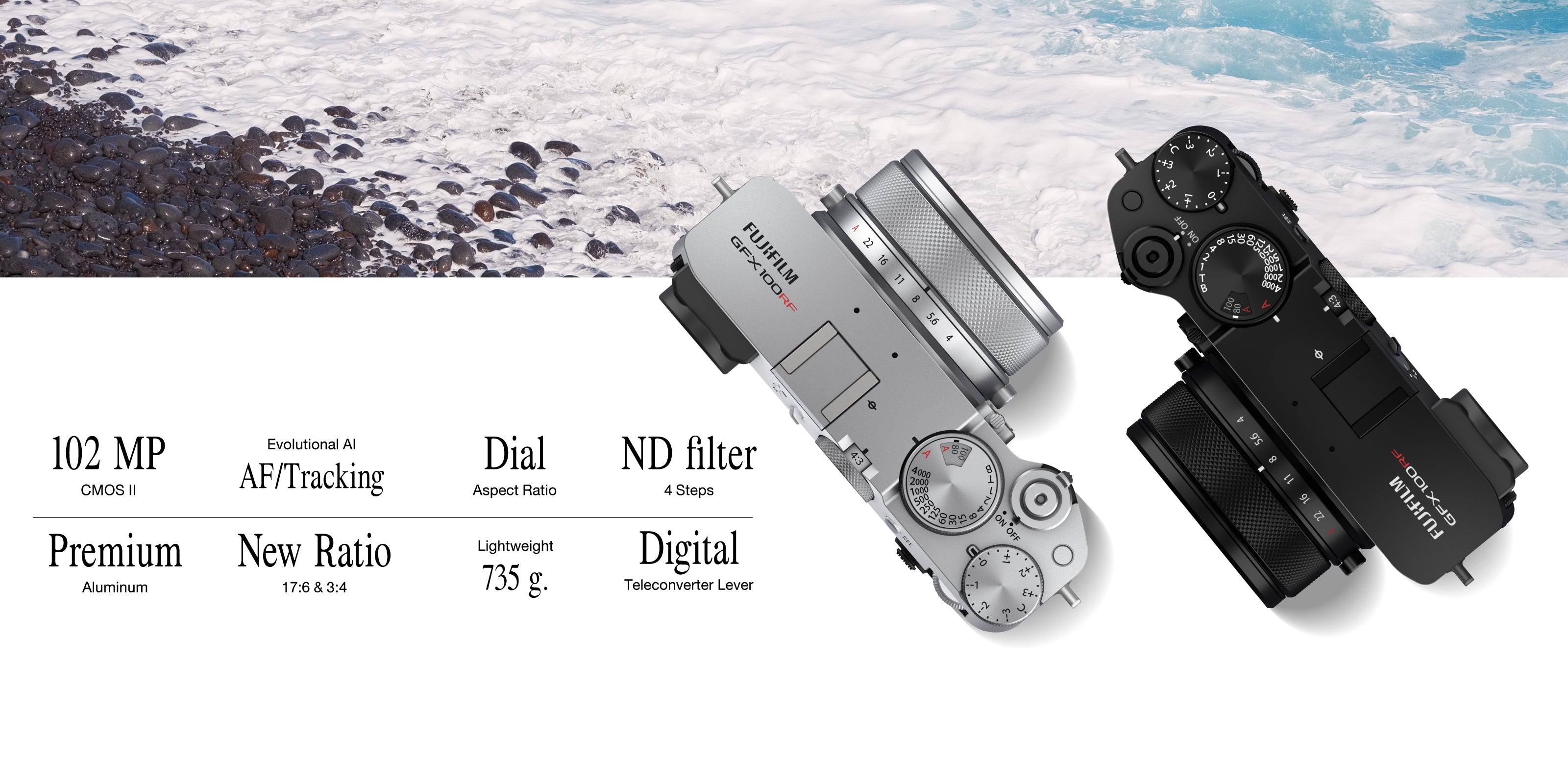 The first fixed-lens medium compact digital camera in the GFX series, it features a 'GFX102MP CMOS II' image sensor with a high resolution of up to 102 million pixels and the latest processing system 'X-Processor 5'. The camera weighs only 735 grams , making it the lightest medium format camera in the GFX series. Even though it is a fixed-lens camera, it still provides outstanding high-quality photography to users.