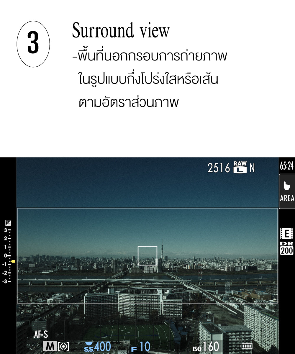 The 3.15-inch, 3:2 aspect ratio, 2.1 million-dot LCD monitor can be tilted up and down, and it also has a new "surround view" function that displays the area outside the shooting frame as semi-transparent or aspect ratio lines.