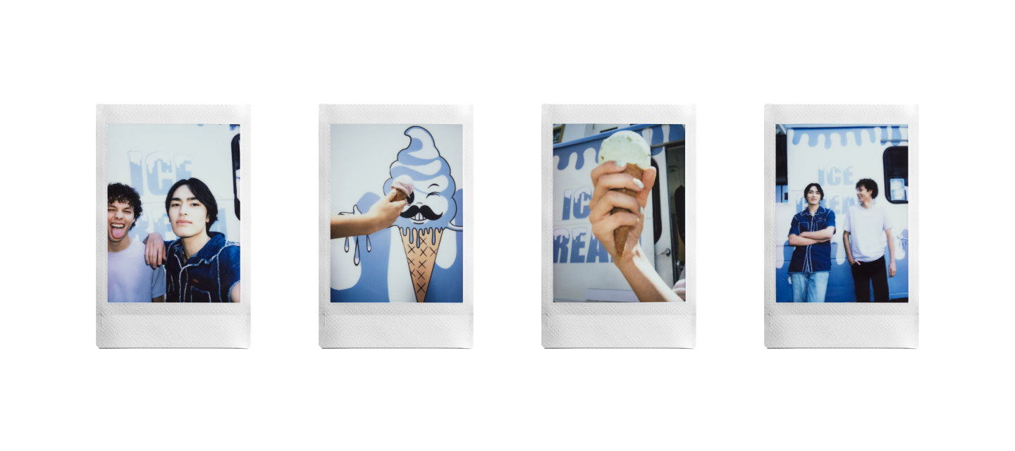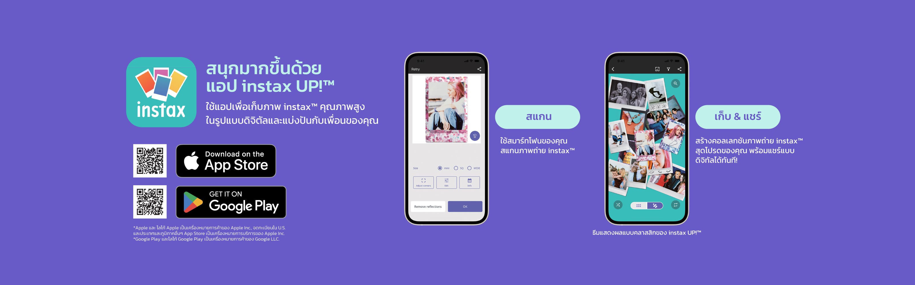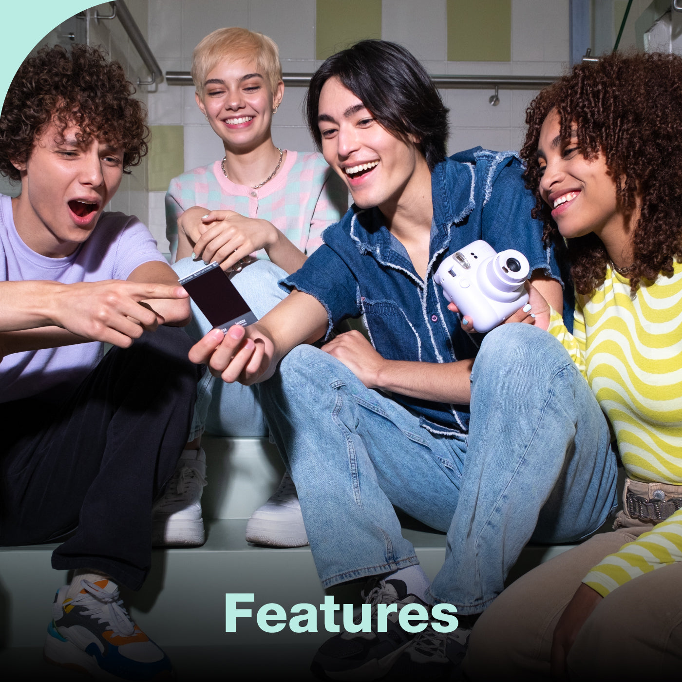 Instax film images are for illustrative purposes only. Specifications are subject to change without notice. Colors of printed images and actual products may differ. Images are overlaid on the smartphone screen.