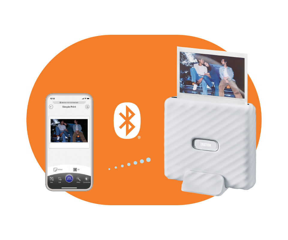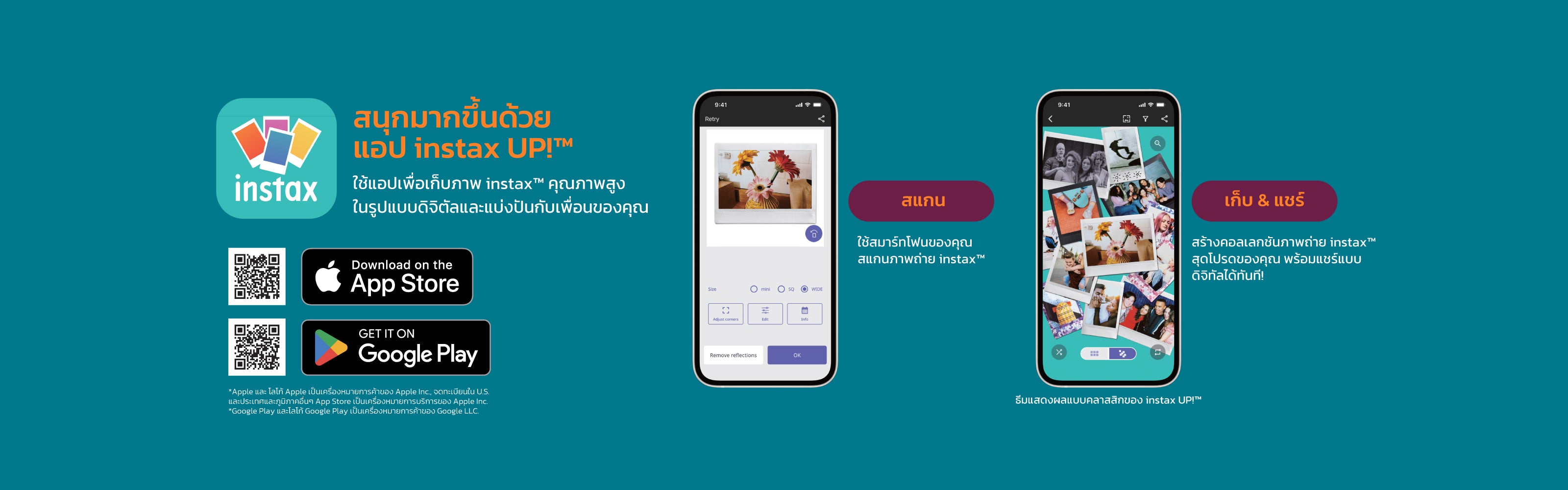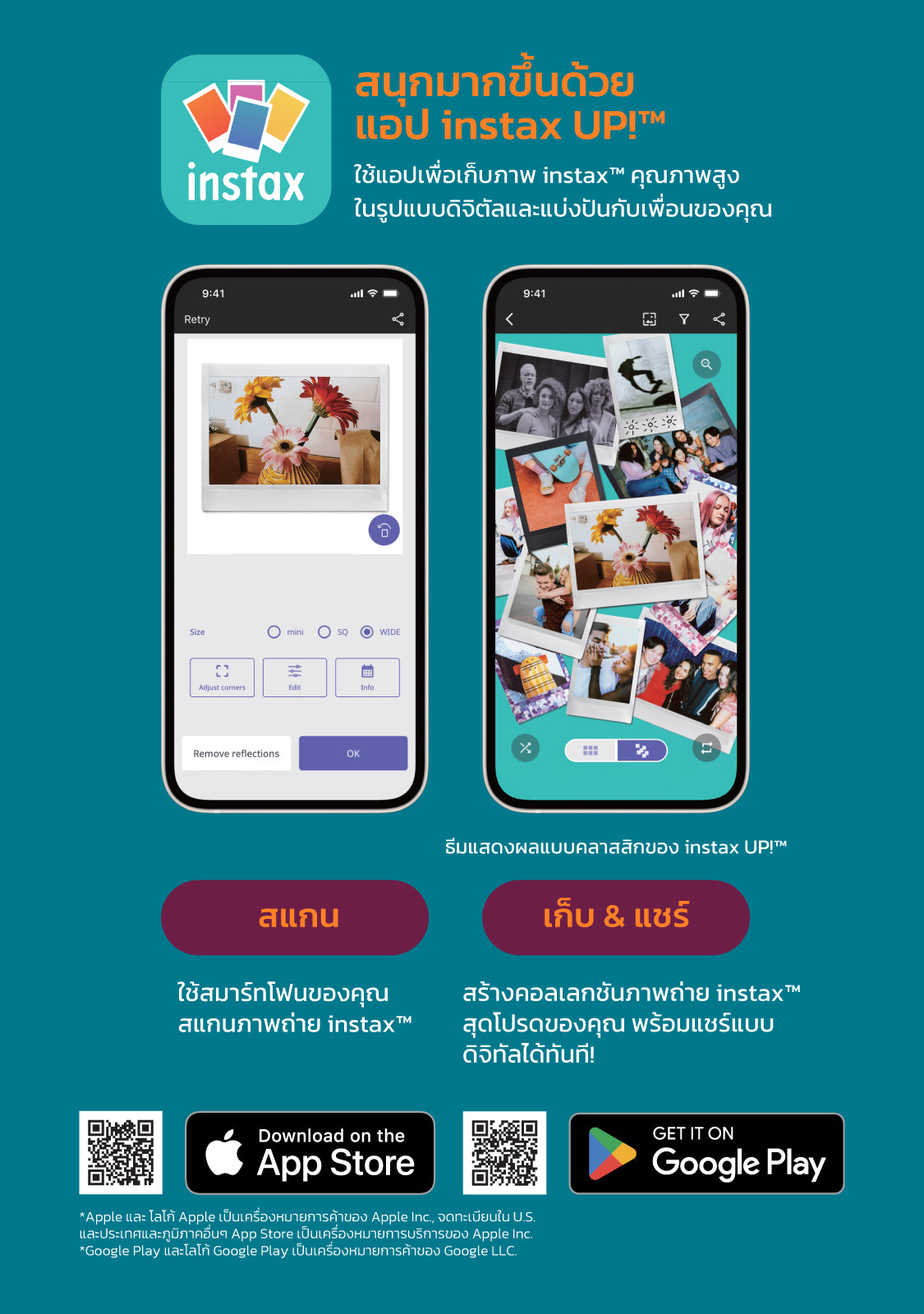 ปริ้นเตอร์ instax ขนาดฟิล์ม wide ภาพใหญ่ถึง 2 เท่า (เมื่อเทียบกับขนาดฟิล์ม mini) ปริ้นรูปฟิล์มจากมือถือผ่านบลูทูธ จะเลือกรูปถ่ายจากมือถือ หรือเลือกรูปช็อตจาก VDO เพื่อปริ้นฟิล์มก็ได้ สามารถบันทึกเสียงในรูปของ QR code แล้วปริ้นภาพฟิล์มได้ พร้อมฟิลเตอร์ กรอบรูป และลูกเล่นอื่นๆอีกมากมายให้คุณตกแต่งรูปฟิล์มได้อย่างสนุกสนานไม่ซ้ำใคร