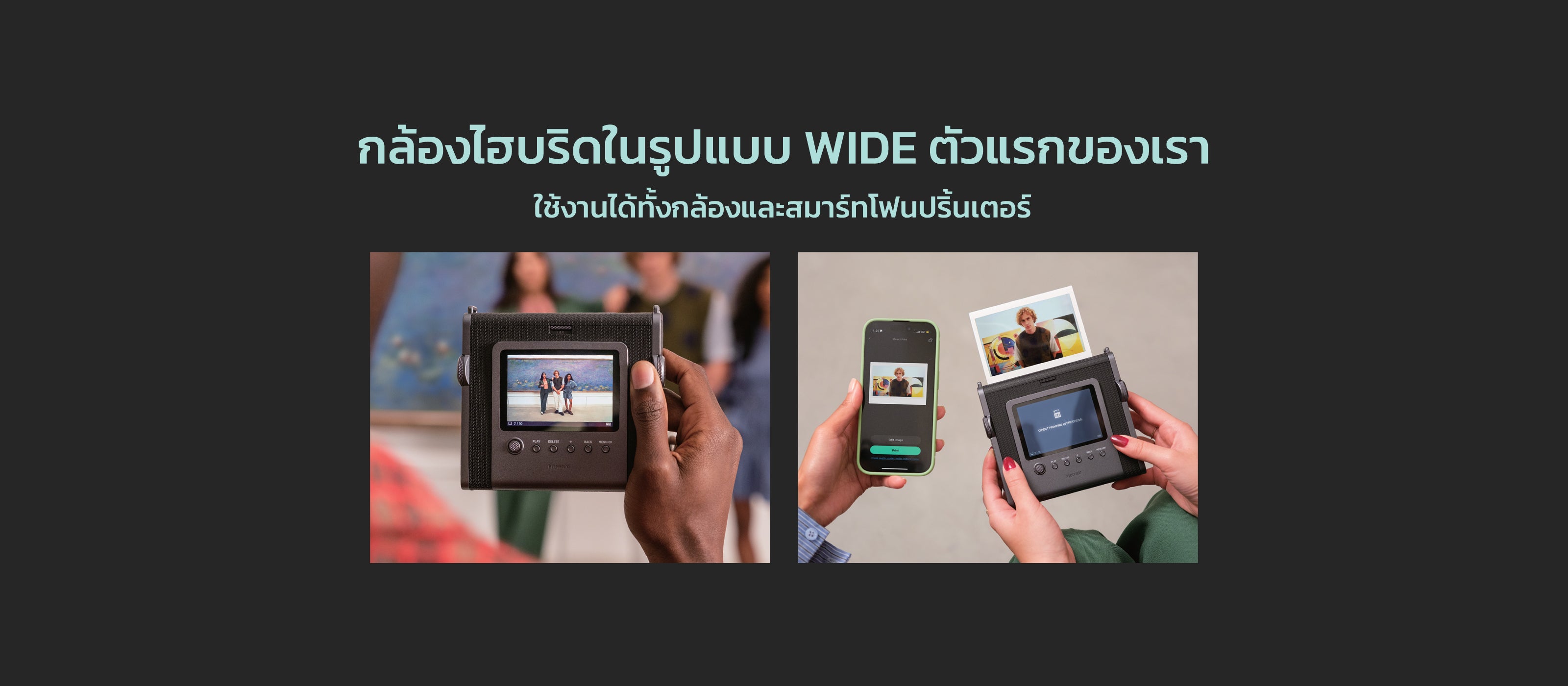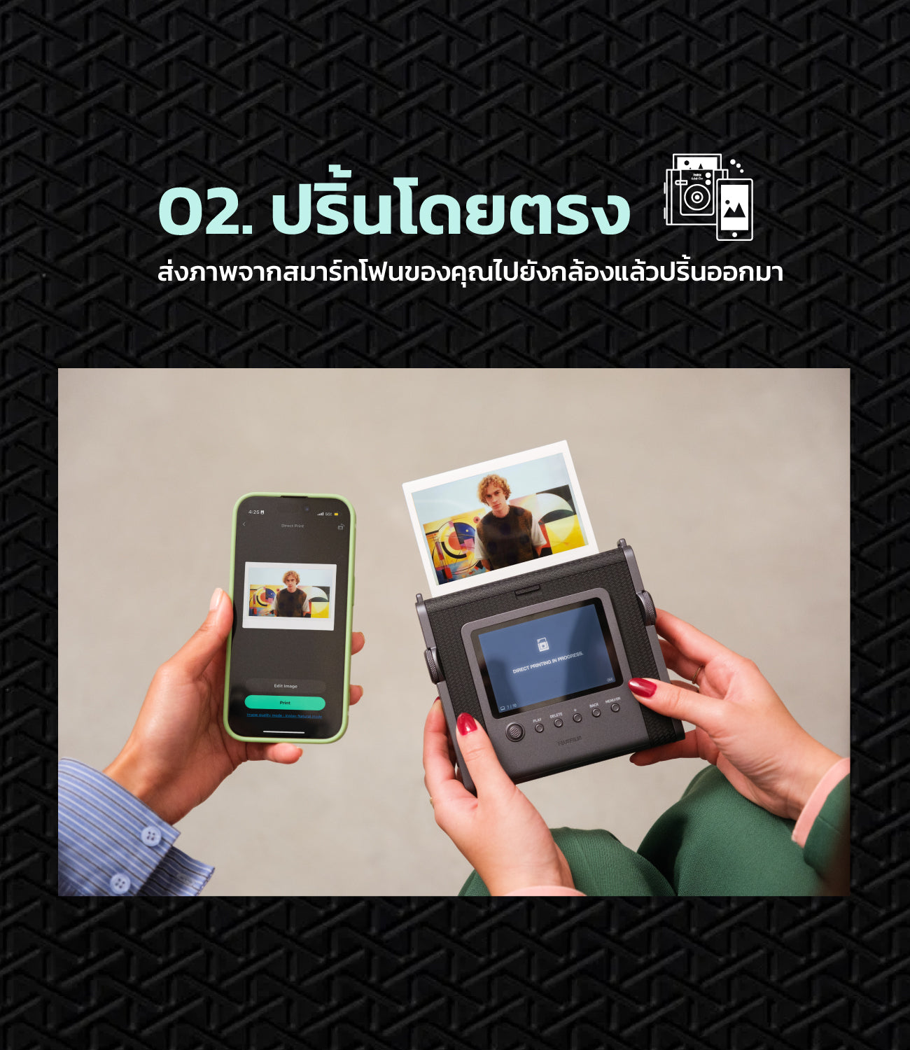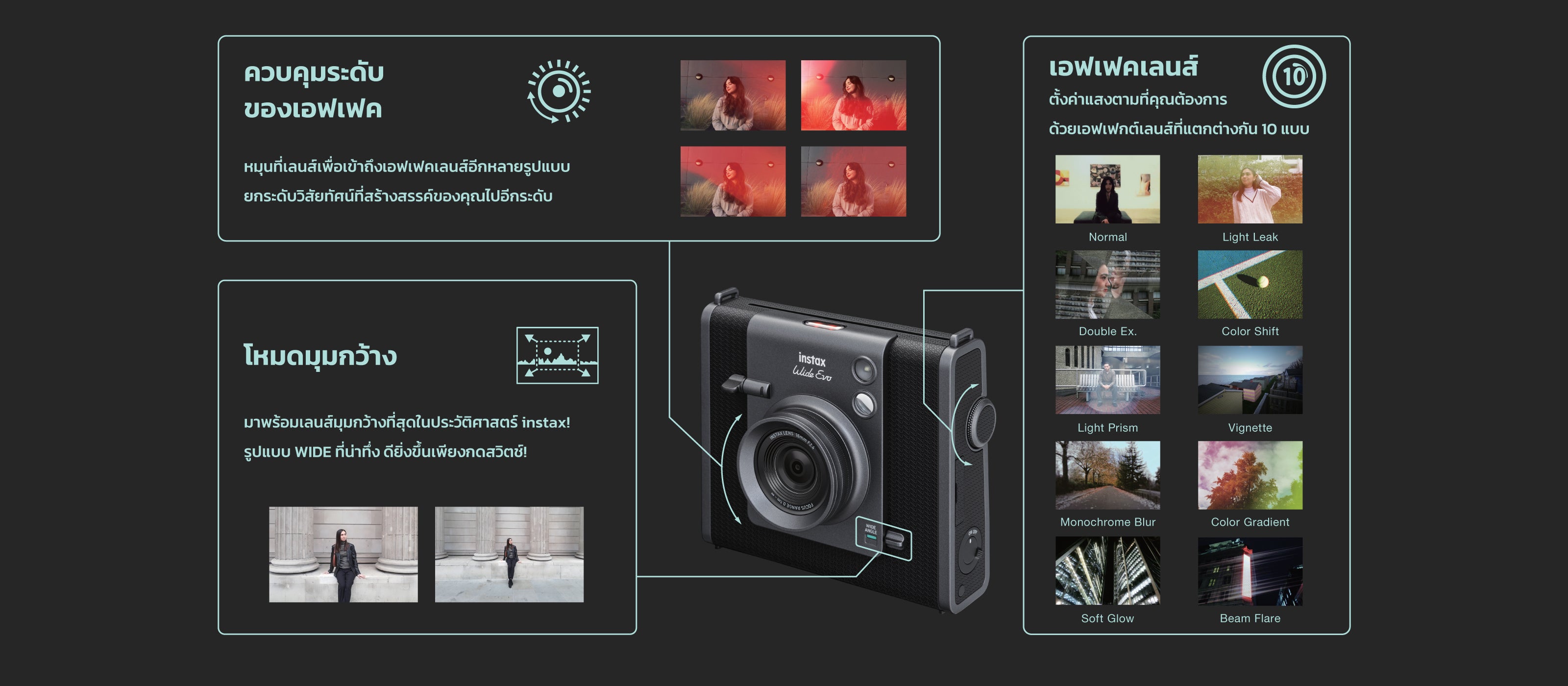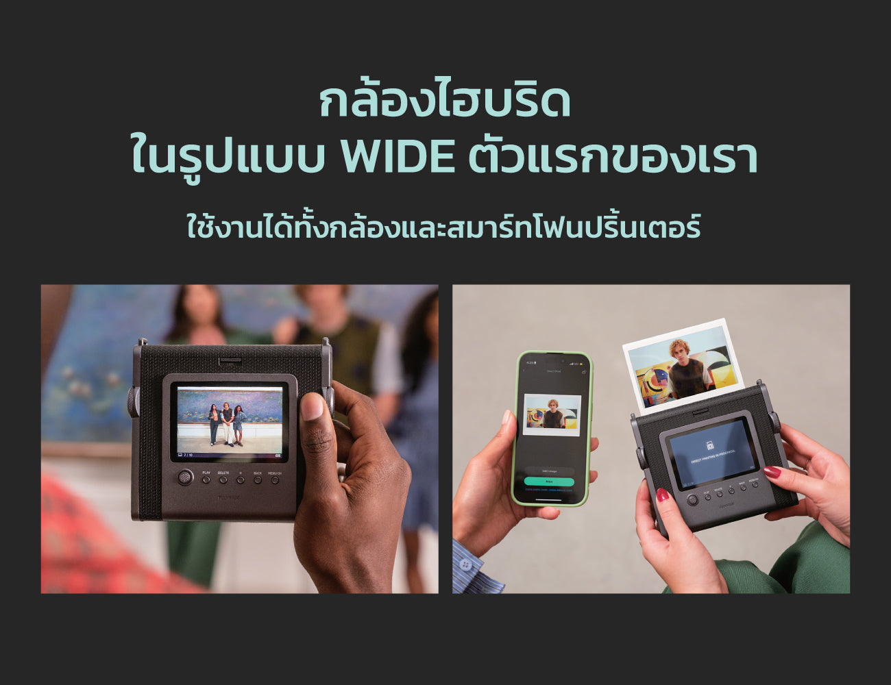 กล้องและปริ้นเตอร์รูปแบบ WIDE จะถ่ายหรือปริ้นก็ทำได้ง่ายๆ ทั้งถ่ายและแชร์รูปผ่านบลูทูธบนแอพพลิเคชั่น สนุกไม่ซ้ำใครกับเอฟเฟคเลนส์ 10 รูปแบบ เอฟเฟคฟิล์ม 10 รูปแบบ รูปแบบฟิล์ม 6 รูปแบบ และยังสามารถปรับระดับของเอฟเฟคได้ถึง 100 รูปแบบ